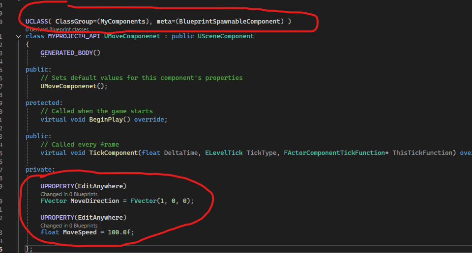 Derudover så har jeg selv tilføjet to private variabler, som er MoveDirection & MoveSpeed. Her benytter jeg en macro som er UPROPERTY, som gør at hvis man tilføjer EditAnywhere, kan man få lov til at redigere værdierne I variablerne I editoren.