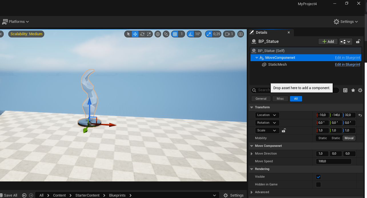 Jeg har til sidst lavet mit eget Blueprint hvor jeg tilføjer mit MoveComponent jeg lige har implementeret, og tilføjer en StaticMesh som er vores skulptur til venstre under vores MoveComponent, for at vores StaticMesh også bevæger sig med vores MoveComponent. Man kan desuden se i højre side at vores variabler er synlige, Move Direction & Move Speed. Når jeg kører spillet vil man se skulpturen bevæge sig i den indtastede retning & hastighed.