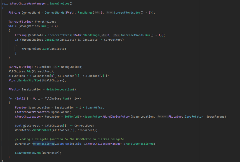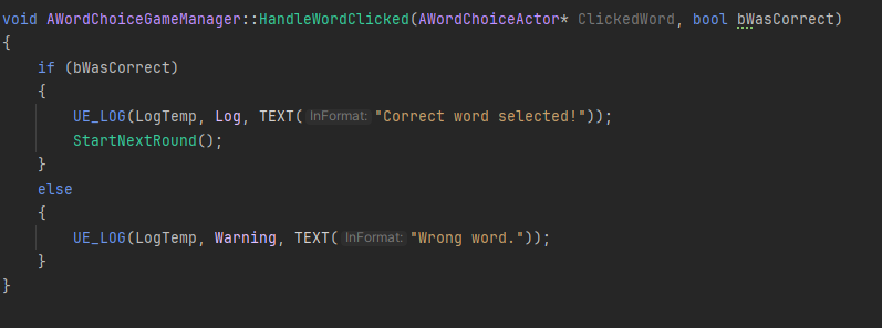 Det er ved OnWordClicked.Broadcast(this, bIsCorrect) at den eksekvere metoderne. Det smarte er så at den sender sig selv som AWordChoiceActor videre og det samme med den boolean som fortæller om ordet er rigtigt stavet. Disse informationer sender den videre til min AWordChoiceGameManager, som står for al logik omkring mit game loop.