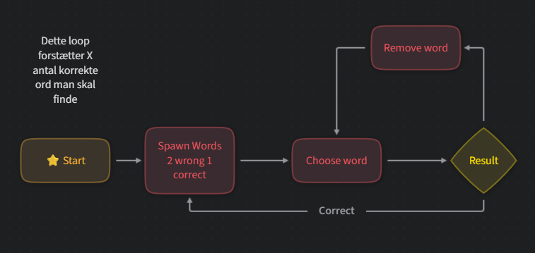 Mål: At kunne implementere en spilmekanik som ud fra mit design siger at man skal have 3 ord, 2 af dem er forkert stavet 1 af dem er korrekt. Hvis man vælger det forkerte så bliver det fjernet så man har 2 valgmuligheder osv. Når man vælger det rigtige ord, så får man en ny runde med ord. Dette fortsætter X antal runder.