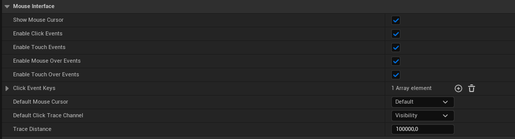 Jeg havde så tanken at man brugte ens mus, eller Touch hvis det var på en IPad til at vælge det ord som er korrekt, så det skulle jeg også have sat op at mouse click events skulle være sat til. Det kunne man så gøre hvis man lavede et nyt PlayerController Blueprint.