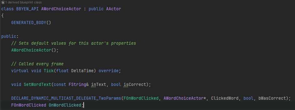 Så gik jeg i gang med at lave selve koden for denne spilmekanik. Jeg skulle have en klasse som stod for at lave selve ordet, det vil sige en klasse hvis formål er at ændre ordet, og håndtere når den registere at den er blevet klikket på. Denne klasse har jeg kaldt for WordChoiceActor, og denne klasse nedarver desuden fra Unreal Engine’s Actor klasse.