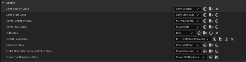 Dette PlayerController blueprint som hedder PC_WizardShop, skulle jeg have ind på min GameMode instans, som hedder GM_WizardShop.