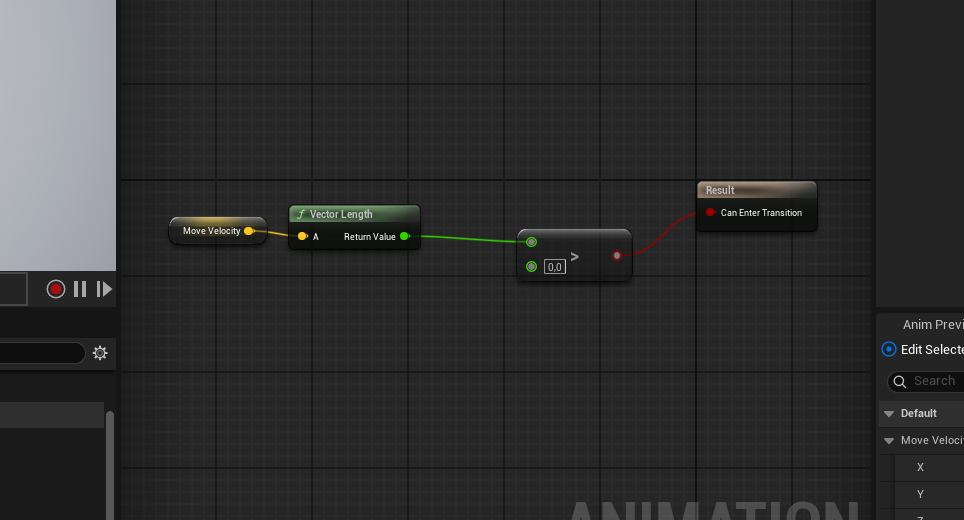 Her er logikken for hvornår den skifter til min Walk animation, den siger at hvis min Move Velocity vector length er højere end 0 skal den gå til min walk animation. I den anden pil har jeg meget af den samme logik, udover at i stedet for den siger hvis den mere end 0, så siger den hvis den er lig 0, hvilket vil sige at man står stille. Derfor skal min Idle animation spille.